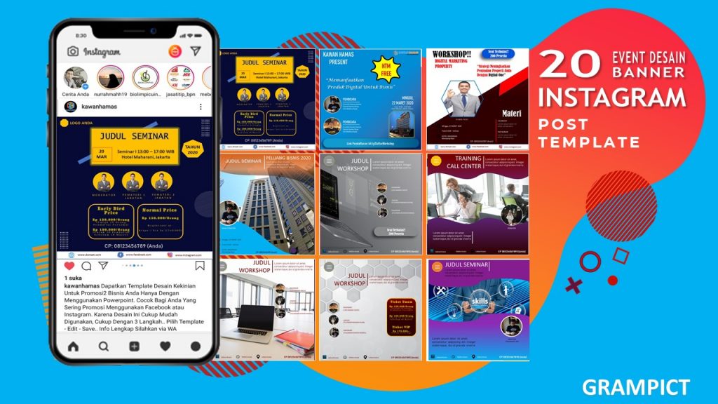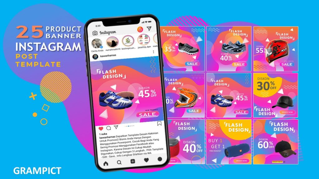 Grampict merupakan template banner Instagram premium siap pakai yang terdiri dari berbagai niche yang dapat diedit dengan mudah menggunakan powerpoint saja. Dengan Grampict, anda dapat dengan mudah membuat banner Instagram yang eye-catching untuk meningkatkan penjualan anda.